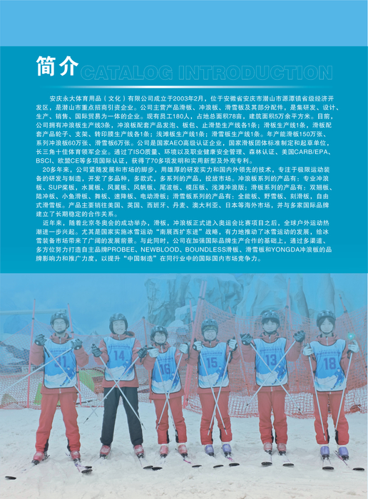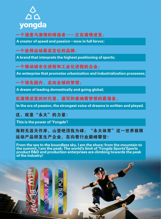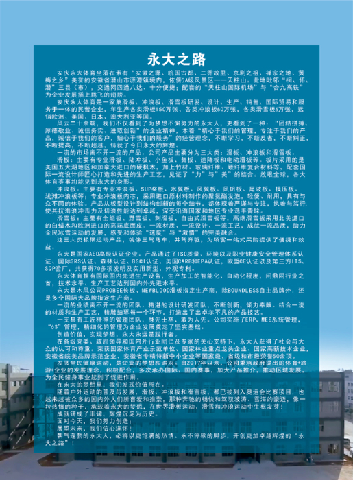 安庆永大体育是一家集滑板、冲浪板、滑雪板研发、设计、生产、销售、国际贸易和服务于一体的民营企业,年生产各类滑板150万张、各类冲浪板60万张,各类滑雪板6万张,远销欧洲、美国、日本、澳大利亚等国。